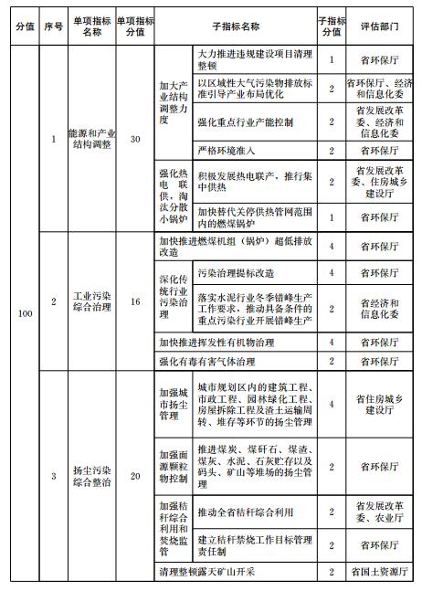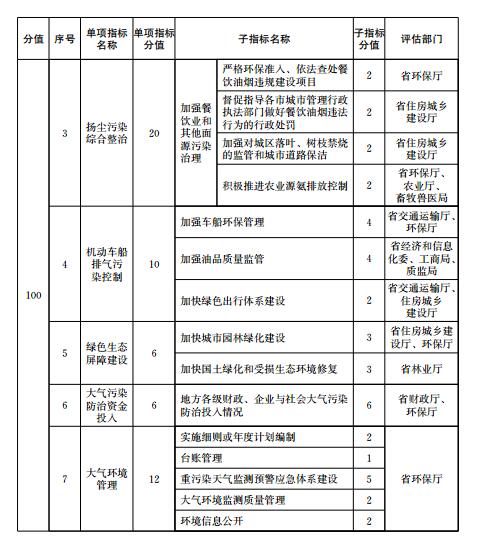 大氣污染防治重點(diǎn)任務(wù)完成情況包括能源和產(chǎn)業(yè)結(jié)構(gòu)調(diào)整、工業(yè)污染綜合治理、揚(yáng)塵污染綜合整治、機(jī)動(dòng)車(chē)船排氣污染控制、綠色生態(tài)屏障建設(shè)、大氣污染防治資金投入、大氣環(huán)境管理等7項(xiàng)指標(biāo)。大氣污染防治重點(diǎn)任務(wù)完成情況各指標(biāo)的定義、評(píng)估要求和計(jì)分方法等由有關(guān)評(píng)估部門(mén)按照《二期行動(dòng)計(jì)劃》的職責(zé)分工確定,評(píng)估部門(mén)根據(jù)子指標(biāo)分值對(duì)各市重點(diǎn)任務(wù)進(jìn)行打分,并向省環(huán)保廳提供評(píng)分結(jié)果。評(píng)估部門(mén)為兩個(gè)部門(mén)以上的,各評(píng)估部門(mén)分別打分后取平均值作為本項(xiàng)重點(diǎn)任務(wù)得分。