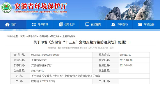 關(guān)于安徽省“十三五”危險(xiǎn)廢物污染防治的具體要求