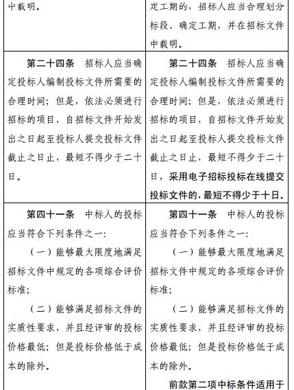五、將第二十四條修改為:“招標(biāo)人應(yīng)當(dāng)確定投標(biāo)人編制投標(biāo)文件所需要的合理時(shí)間;但是,依法必須進(jìn)行招標(biāo)的項(xiàng)目,自招標(biāo)文件開(kāi)始發(fā)出之日起至投標(biāo)人提交投標(biāo)文件截止之日止,最短不得少于二十日,采用電子招標(biāo)投標(biāo)在線(xiàn)提交投標(biāo)文件的,最短不得少于十日。”