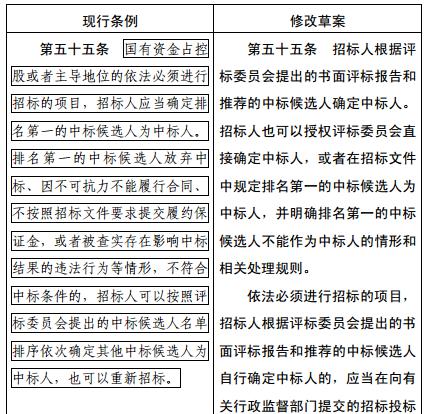 一、將第五十五條修改為:“招標(biāo)人根據(jù)評(píng)標(biāo)委員會(huì)提出的書(shū)面評(píng)標(biāo)報(bào)告和推薦的中標(biāo)候選人確定中標(biāo)人。招標(biāo)人也可以授權(quán)評(píng)標(biāo)委員會(huì)直接確定中標(biāo)人,或者在招標(biāo)文件中規(guī)定排名第一的中標(biāo)候選人為中標(biāo)人,并明確排名第一的中標(biāo)候選人不能作為中標(biāo)人的情形和相關(guān)處理規(guī)則。