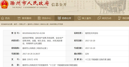 滁州市政府印發(fā)《滁州市“十三五”節(jié)能減排實施方案》