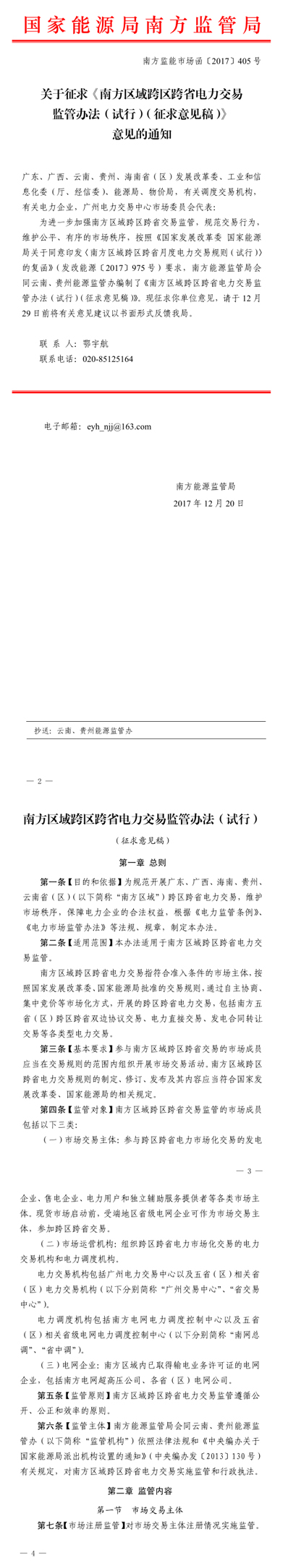 近日,國(guó)家能源局南方監(jiān)管局日前發(fā)布了《關(guān)于征求南方區(qū)域跨區(qū)跨省電力交易監(jiān)管辦法(試行)(征求意見(jiàn)稿)意見(jiàn)的通知》,辦法適用于南方區(qū)域(廣東、廣西、海南、云南、貴州)跨區(qū)跨省電力交易監(jiān)管。在征求意見(jiàn)期間,有意見(jiàn)可以反饋到國(guó)家能源局南方監(jiān)管局,截止日期為12月29日。
