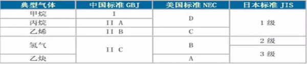 中國、美國、日本典型爆炸性氣體分組對照
