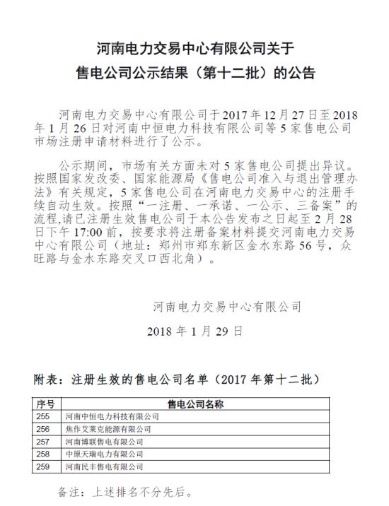 日前,河南電力交易中心發(fā)布了關(guān)于售電公司公示結(jié)果(第十二批)的公告,公告中稱,于2017年12月27日至2018年1月26日對河南中恒電力科技有限公司等5家售電公司注冊申請材料進(jìn)行了公示,未收到異議,注冊手續(xù)自動生效。