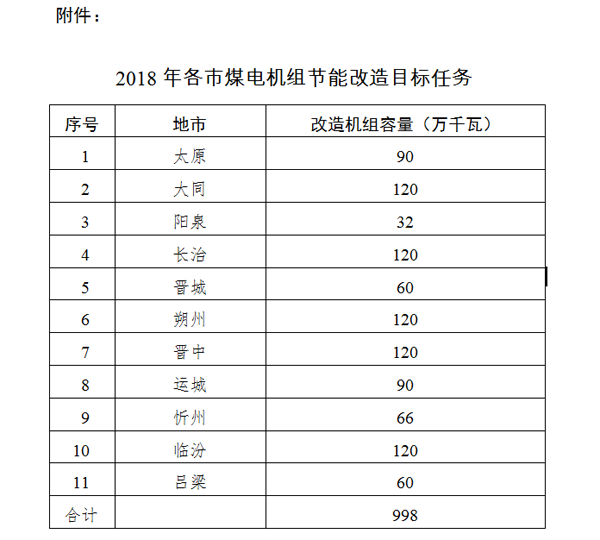 近日,山西省印發(fā)了《2018年各市燃煤機組節(jié)能改造目標任務(wù)》。具體任務(wù)如下: