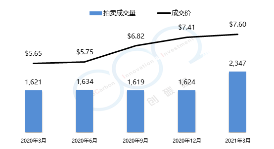 RGGI碳市場的初始配額發(fā)放以拍賣為主,每個季度舉行一次拍賣。2021年第一季度拍賣成交均價為$7.60美元,較上一季度漲幅為2.5%。由于弗吉尼亞州的加入,RGGI總成交量創(chuàng)歷史新高,達(dá)到了2347萬噸。以下是由中創(chuàng)碳投統(tǒng)計的RGGI近一年的交易情況。
