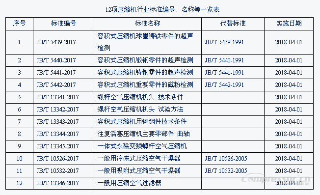 2017年第48號中華人民共和國工業(yè)和信息化部公告,工業(yè)和信息化部批準(zhǔn)發(fā)布了壓縮機(jī)行業(yè)標(biāo)準(zhǔn)12項(xiàng)看具體內(nèi)容見下表。