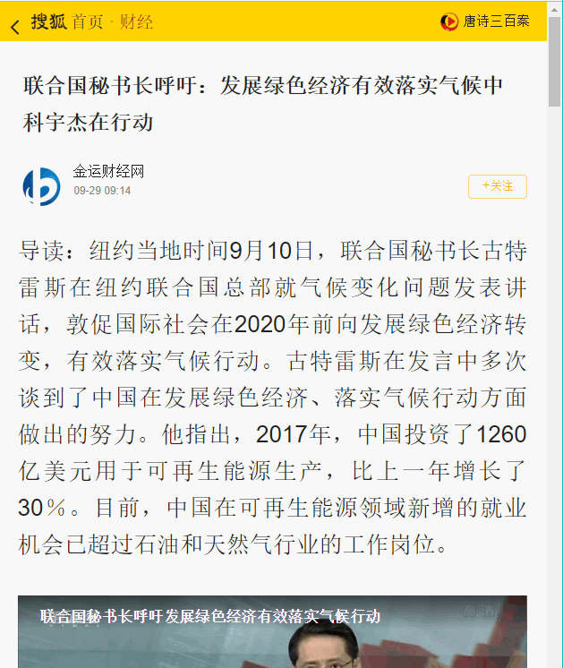 導(dǎo)讀:紐約當(dāng)?shù)貢r(shí)間9月10日,聯(lián)合國(guó)秘書(shū)長(zhǎng)古特雷斯在紐約聯(lián)合國(guó)總部就氣候變化問(wèn)題發(fā)表講話,敦促?lài)?guó)際社會(huì)在2020年前向發(fā)展綠色經(jīng)濟(jì)轉(zhuǎn)變,有效落實(shí)氣候行動(dòng)。古特雷斯在發(fā)言中多次談到了中國(guó)在發(fā)展綠色經(jīng)濟(jì)、落實(shí)氣候行動(dòng)方面做出的努力。他指出,2017年,中國(guó)投資了1260億美元用于可再生能源生產(chǎn),比上一年增長(zhǎng)了30%。目前,中國(guó)在可再生能源領(lǐng)域新增的就業(yè)機(jī)會(huì)已超過(guò)石油和天然氣行業(yè)的工作崗位。