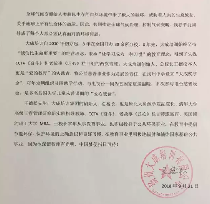 王德松先生:大成培訓(xùn)集團(tuán)的創(chuàng)始人、總校長(zhǎng),也是原北大資源學(xué)院副院長(zhǎng)、清華大學(xué)高級(jí)工商管理研修班實(shí)踐指導(dǎo)教師、CCTV《奮斗》、老故事《匠心》欄目特邀嘉賓、美國(guó)紐約理工大學(xué)MBA。王校長(zhǎng)常年從事教育事業(yè),也積極投身于公共環(huán)保事業(yè),他常常教導(dǎo)學(xué)生要注意節(jié)能環(huán)保、要保護(hù)我們生存環(huán)境。他在教育事業(yè)里積極地輻射和輔佐國(guó)家基礎(chǔ)公共事業(yè),因?yàn)樗钪O教師有光明,中國(guó)夢(mèng)便指日可待!