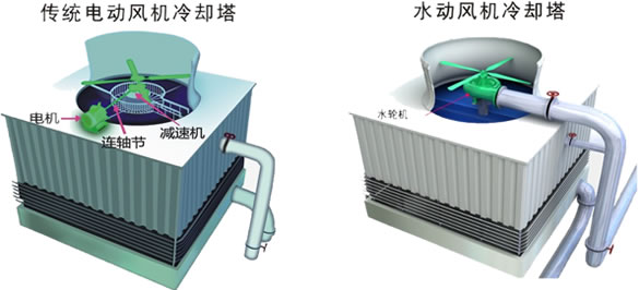 水輪機取代傳統(tǒng)冷卻塔中的電機、連軸節(jié)、減速機、達到節(jié)電效果