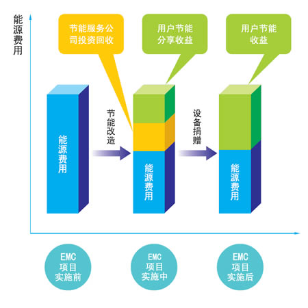 EMC 為客戶提供能源系統(tǒng)診斷、節(jié)能項(xiàng)目可行性分析、節(jié)能項(xiàng)目設(shè)計(jì),幫助項(xiàng)目融資,選擇并采購(gòu)設(shè)備、安裝調(diào)試、進(jìn)行項(xiàng)目管理、培訓(xùn)操作人員、合同期內(nèi)系統(tǒng)設(shè)備維 護(hù)、節(jié)能量監(jiān)測(cè)等一條龍服務(wù),然后與客戶共同驗(yàn)證項(xiàng)目的節(jié)能效果、環(huán)境效益與經(jīng)濟(jì)效益,最后,與客戶分享項(xiàng)目實(shí)施后取得的經(jīng)濟(jì)效益,回收項(xiàng)目的投資和獲得 應(yīng)有的利潤(rùn)。